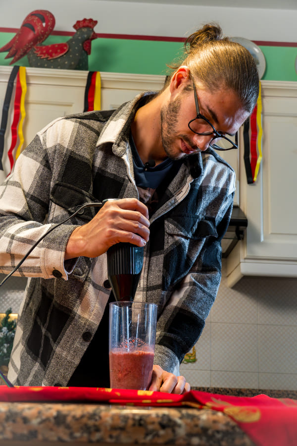 - Višnje malo odcedimo in vse skupaj zmiksamo v gladek pire. Kakavove kekse zmeljemo v drobtine.