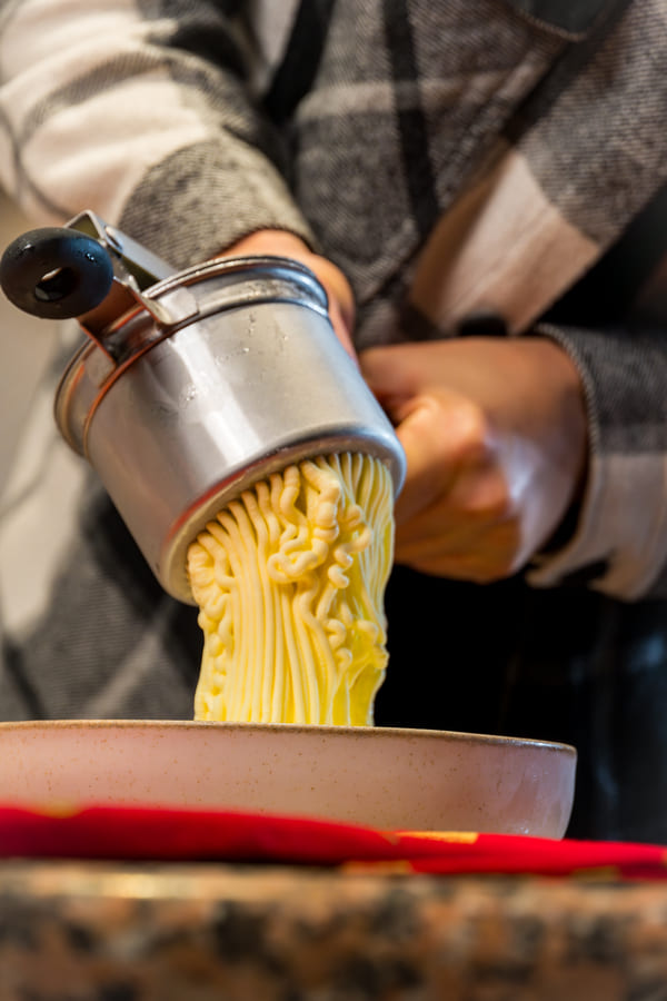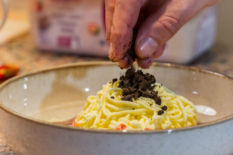 - V stiskalec za krompir nadevamo Leone vanilijev sladoled in ga iztisnemo na krožnik za serviranje.