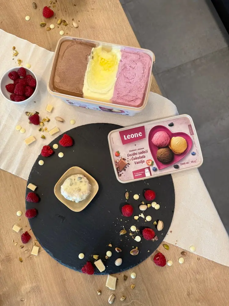 - Skodelico obložimo z živilsko folijo. Nadevamo Leone sladoled in v sredino potisnemo svežo malino. Vse skupaj prekrijemo s plastjo sladoleda.